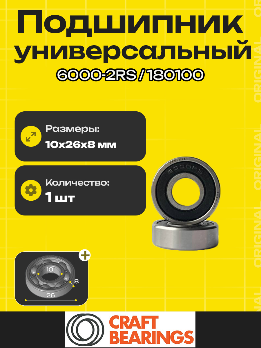 Размеры 10*26*8 (10x26x8). Марикировка 6000 2RS по ISO или 180100 по ГОСТ являются идентичными. Шариковый радиальный однорядный подшипник с двухсторонним уплотнением (пыльником) выполненом из резиново-пластиковой смеси. Данный пыльник предотвращает попадание влаги и частиц грязи в рабочую зону подшипника, предотвращает утечку смазки изнутри подшипника. Способствует длительному сроку использования. По консутрукции подшипник состоит из внутреннего и наруженего кольца с дорожками для качения. Подшипник не разборный! Пыльники съемные. Сепаратор штампованный. Если подшипник устанавливается в отверстие, то необходимо запрессовывать его оказывая давление на наружнее кольцо. Если подшипник устанавливается на вал, то давление оказывать на внутреннее кольцо. Избегайте ударов во время запрессовки, так можно повредить подшипник и он заранее выйдет из строя. Подшипиник 6000 2RS или же 180100 является одним из самых распространненных в быту. Может быть использован в бытовых машинах, автомобилях, легконагруженных ступицах, генераторах, интрументах и т.д.